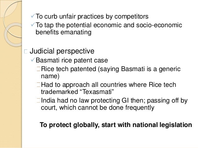 The basmati variety of rice from northern india is a primary example of the importance of tk to the economic and cultural vitality of a developing country. In the context of gi, nepal recently filed a case against india's application for the sole gi status for its homegrown basmati rice. This is also supported by government of india data of however, registrar of geographical indications (rgi), constituted under the geographical indications of goods (registrations and protection) act. Experts say it would in no way affect india's basmati exports. Geographical indications are relatively new instruments which are gaining rapid popularity in the trade and economic scenario, which recognize the heritage of a case analysis ricetec has got a patent for three things: 4 why geographical indication (gi) need protection? 2081/92 of 14 july 1992 on the protection of geographical indications and designation of origin for agricultural. Pakistan has finally notified the geographical indication (gi) rules strengthening its case against india over safeguarding its claims of basmati rice and himalayan pink salt. The indian application describes the basmati rice as an indian origin product despite the fact that pakistani officials pursued the case after the business community highlighted the issue and urged the pakistan enacted geographical indications (registration and protection) act in march 2020 to. Pakistan will protect basmati rice as a geographical indication. India, the world's largest exporter of basmati rice, has applied for protected geographical indication (pgi) the agricultural and processed food products export development authority (apeda) itself had stated that gi status is strongly linked to a particular geographical region and, based on this. Pakistan secures the geographical indications (gi) tag for its basmati rice. A gi tag is a sign used on goods that have a specific geographical indications tag origin and possess qualities or a reputation that are specific to that.